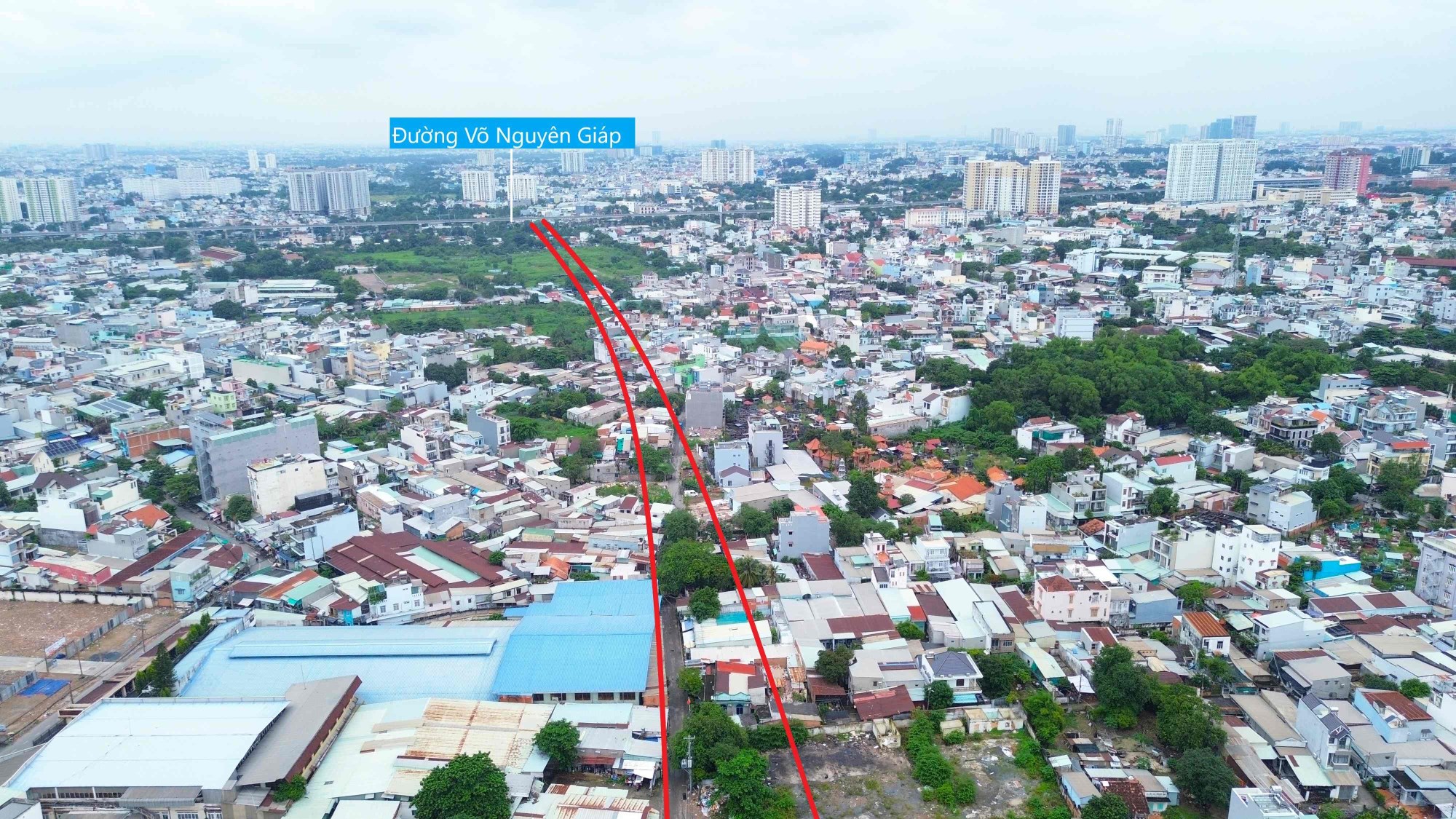 Còn nút giao Bình Thái giao với đường Võ Nguyên Giáp (trước là Xa lộ Hà Nội) có dạng hoa thị hoàn chỉnh, bao gồm cầu thép dọc tuyến Vành đai 2 vượt qua đường Võ Nguyên Giáp, kết hợp hệ thống hầm chui trên các tuyến song hành để đảm bảo lưu thông liên tục. Hiện nay, Ban Giao thông đang khẩn trương triển khai công tác lập, thẩm định và phê duyệt thiết kế bản vẽ thi công, đồng thời chuẩn bị các bước lựa chọn nhà thầu xây lắp. Dự kiến khởi công nút giao thông Bình Thái vào cuối tháng 12/2025. Trong ảnh là đường Võ Nguyên Giáp hiện nay với metro Bến Thành - Suối Tiên đi dọc tuyến.