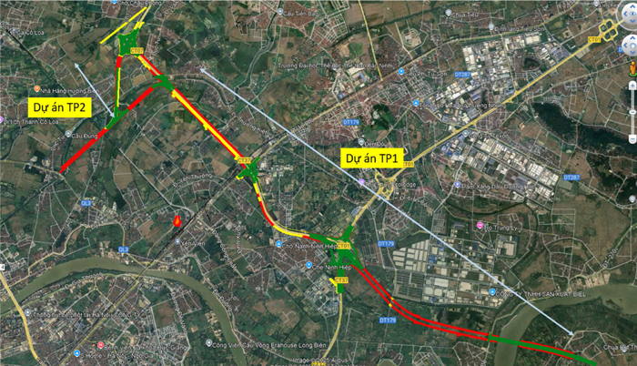 Trong ảnh là sở đồ đường nối sân bay Gia Bình đoạn chạy qua Hà Nội. Nút giao kết nối đường dẫn lên cầu Tứ Liên và ba nhánh cao tốc là nút giao đầu tiên bên trái sơ đồ.
