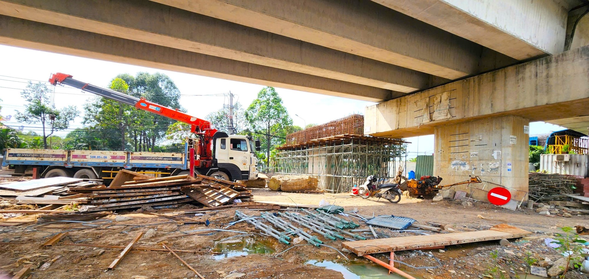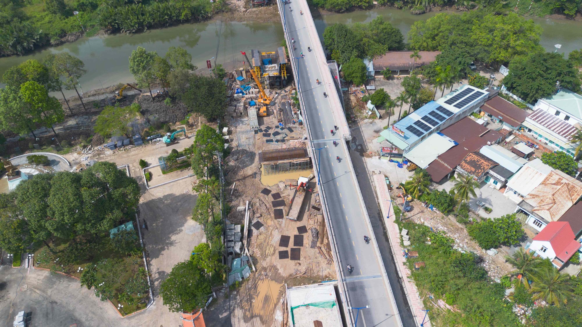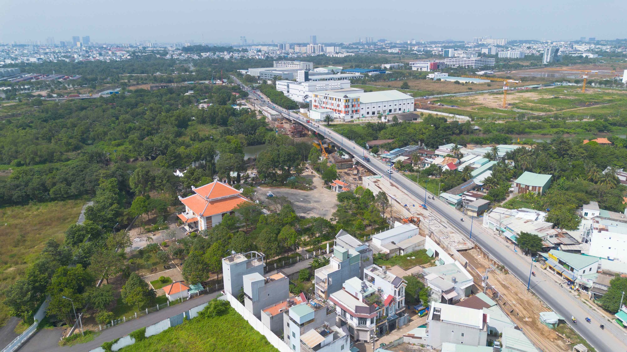 Thi công cầu Tăng Long hiện nay, có thể thấy hệ thống đường dẫn vào đơn nguyên bên phải, đoạn dẫn từ đường Võ Chí Công lên cầu Tăng Long hiện đã hình thành.