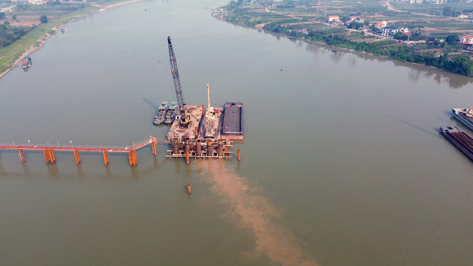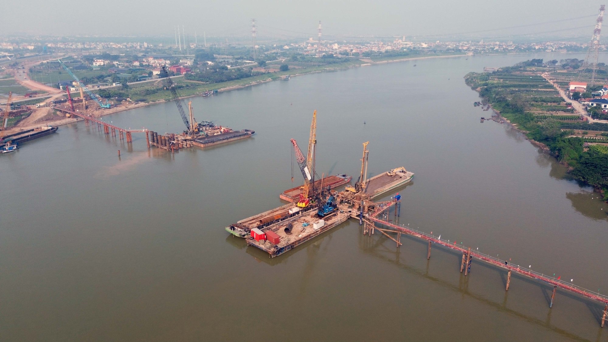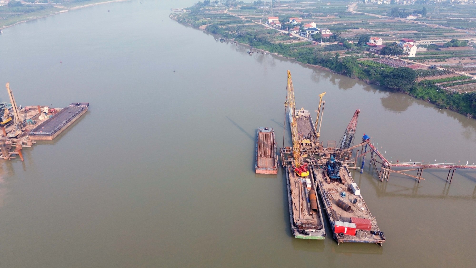 Máy móc, thiết bị hiện đại cùng hàng trăm kỹ sư, công nhân được huy động để tăng tốc tiến độ, đặc biệt ở khu vực bãi sông và lòng sông Hồng – nơi có điều kiện thi công phức tạp.