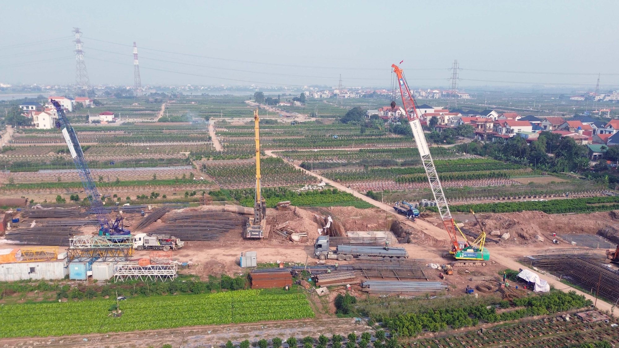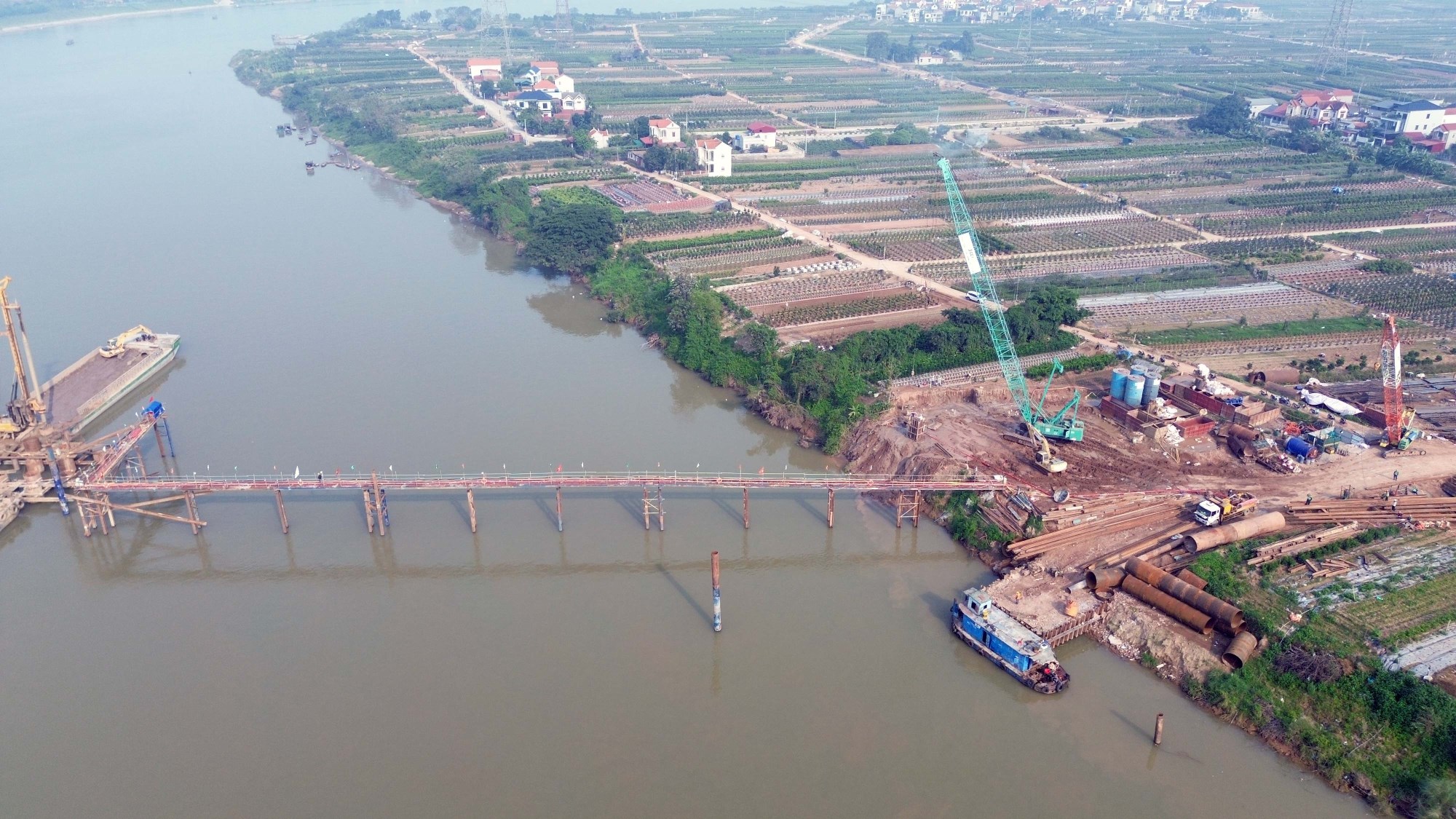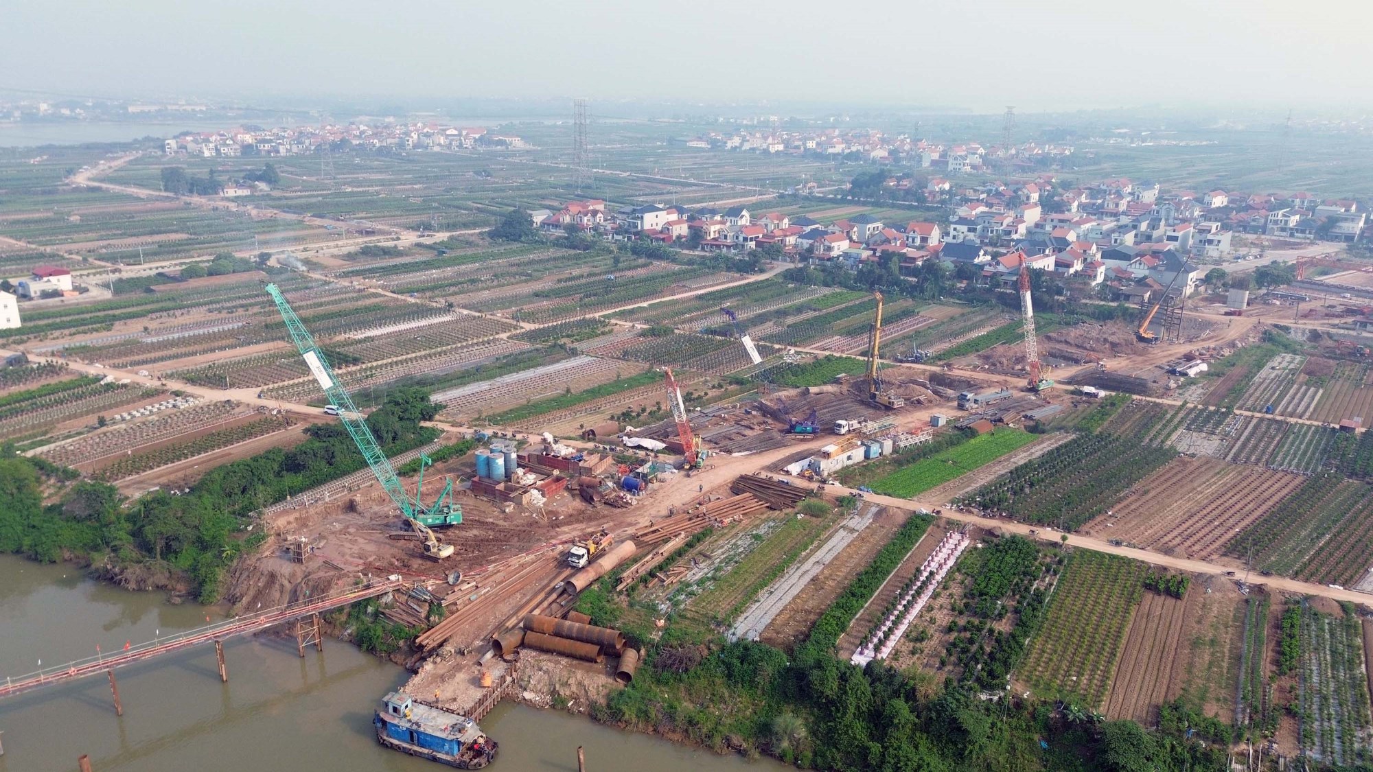 Máy móc, thiết bị hiện đại cùng hàng trăm kỹ sư, công nhân được huy động để tăng tốc tiến độ, đặc biệt ở khu vực bãi sông và lòng sông Hồng – nơi có điều kiện thi công phức tạp.