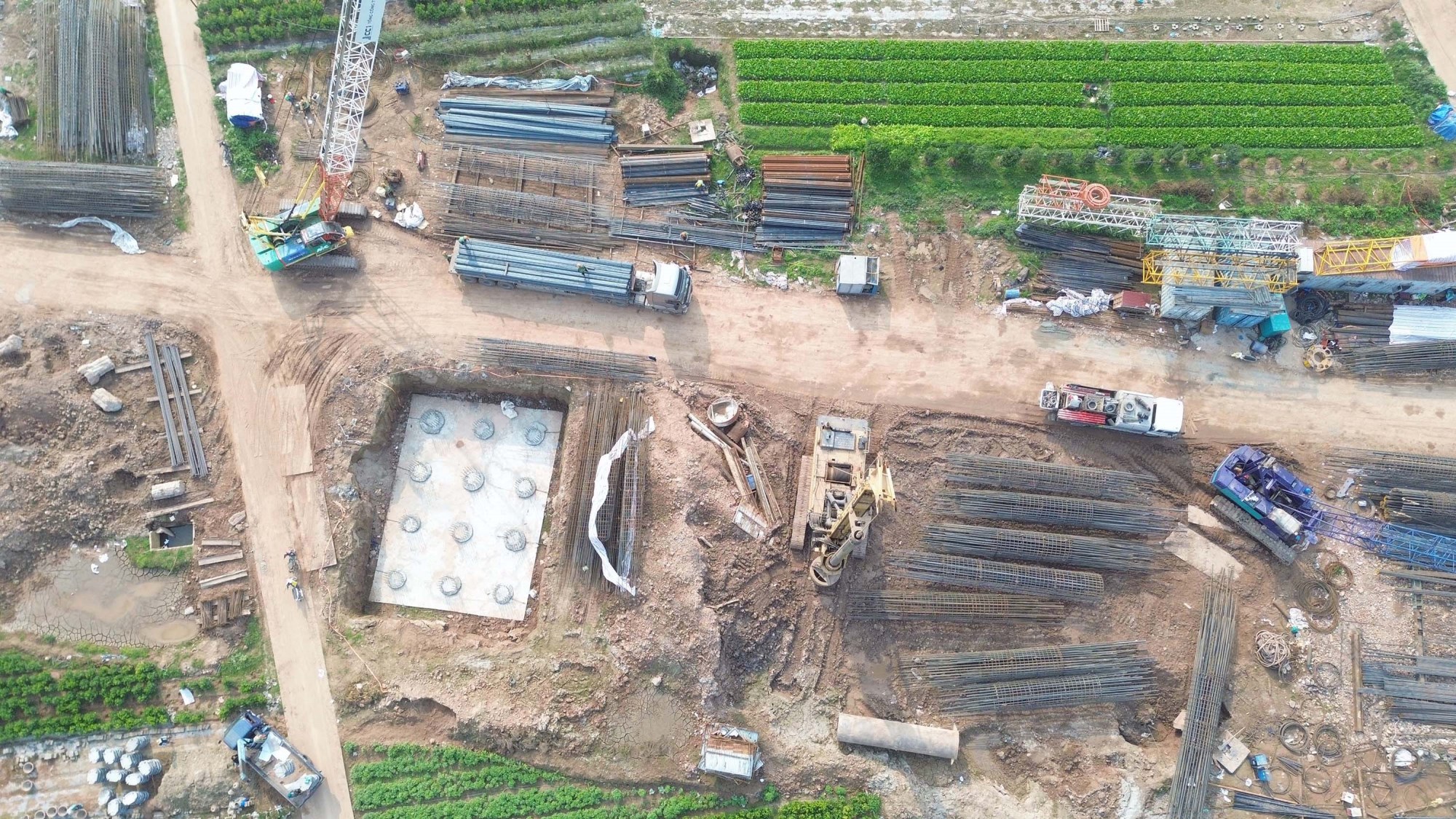Hiện nay, trên công trường, không khí thi công đang diễn ra khẩn trương. Các nhà thầu đã đồng loạt triển khai nhiều hạng mục như nền đường, móng trụ và cọc khoan nhồi.