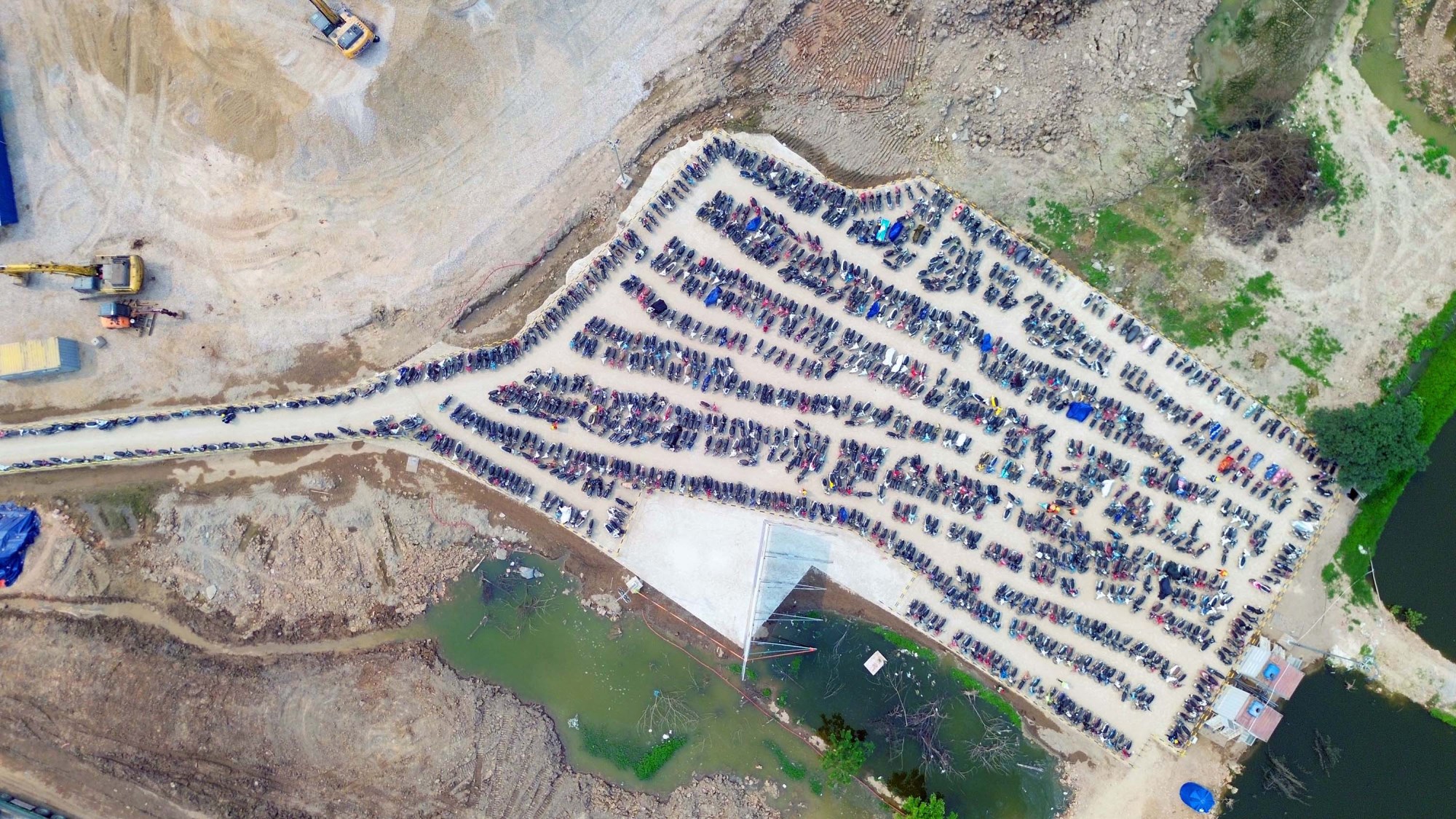 Tại dự án, một bãi đỗ xe máy với cả ngàn chiếc cho thấy số lượng lớn công nhân, kỹ sư làm việc tại dự án.