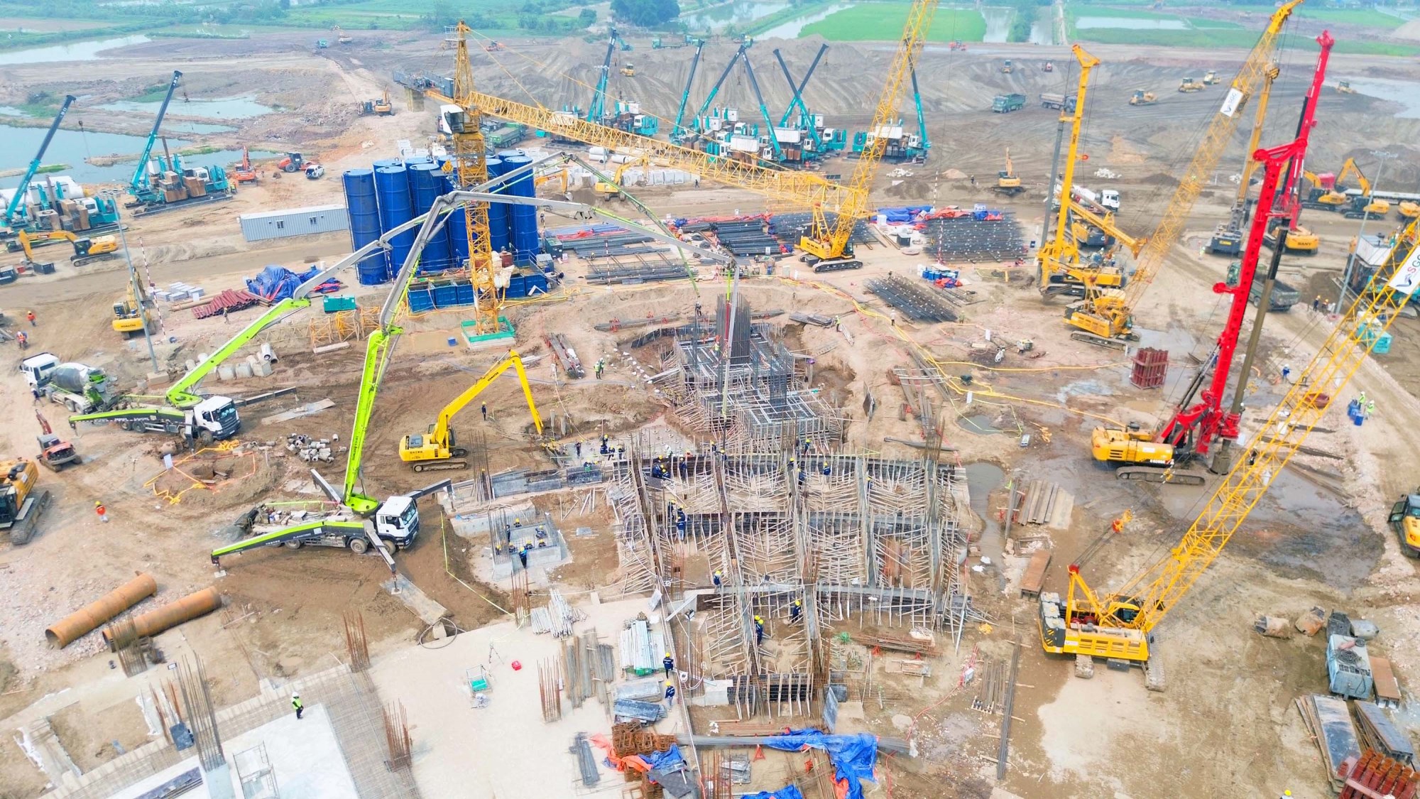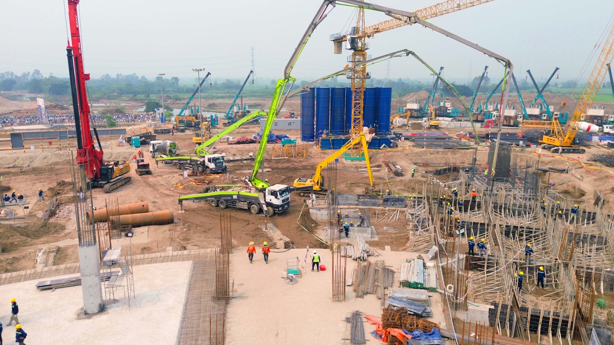 Theo ghi nhận của người viết, trên công trường rộng hàng chục ha, hàng trăm công nhân cùng máy móc, thiết bị đang hoạt động liên tục.