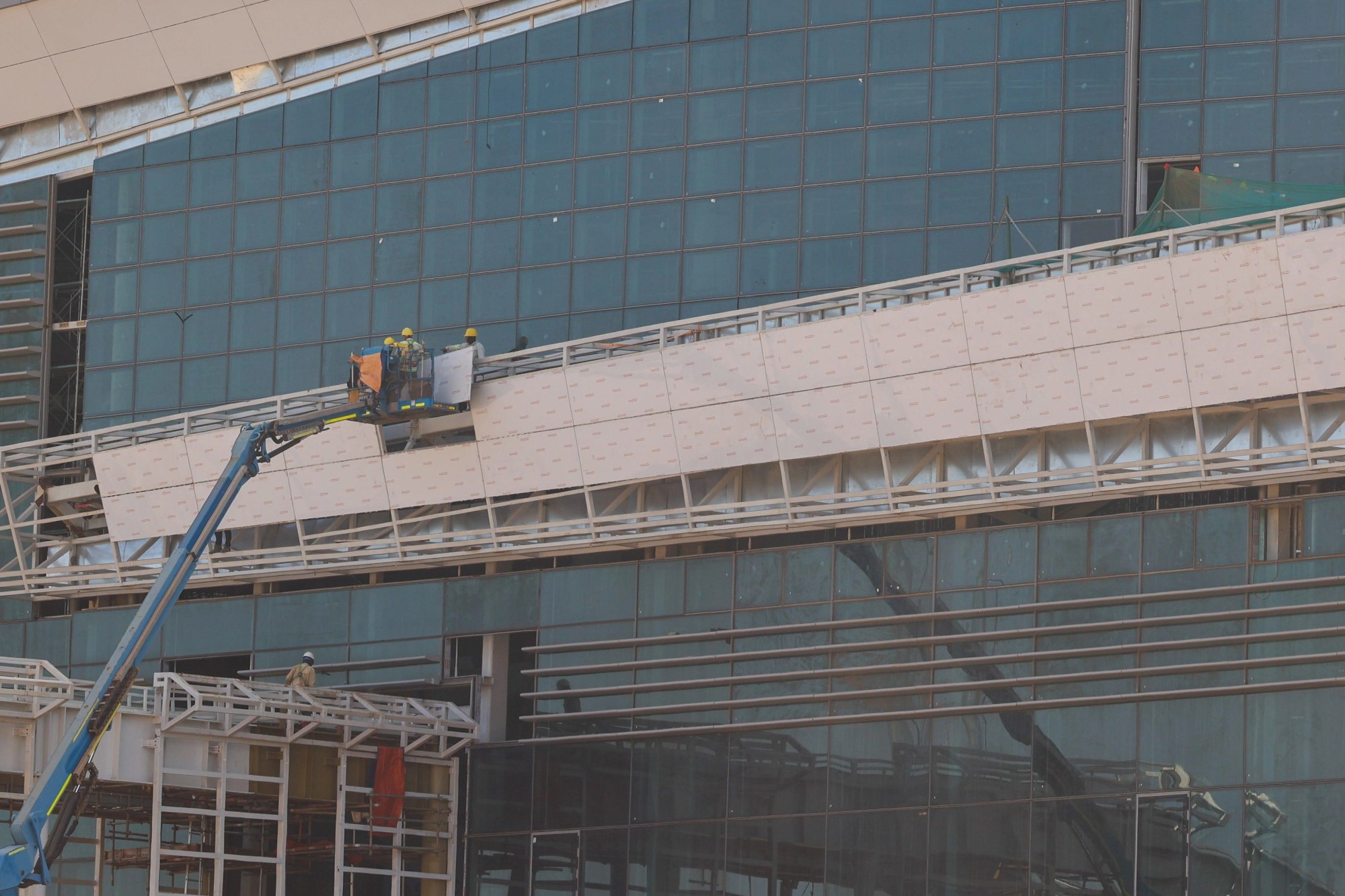 Từng nhóm công nhân được xe cẩu nâng lên để hoàn thiện phần kính. Mỗi tấm kính nặng khoảng 350-900 kg.