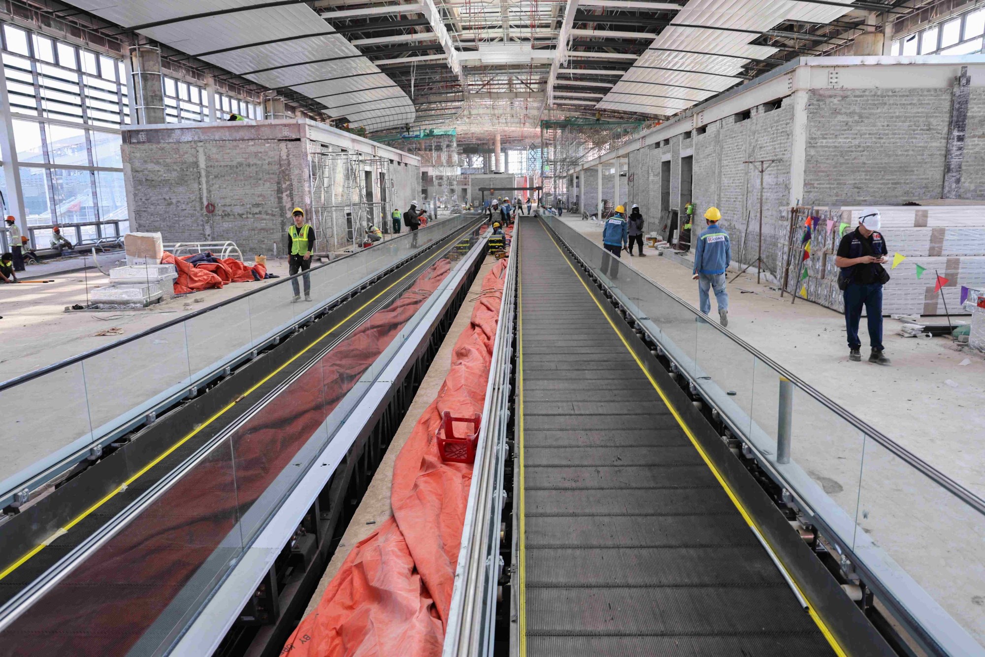 Hệ thống thang bộ, thang máy, băng tải và băng chuyền đang được lắp đặt giữa các tầng nhà ga, yêu cầu độ chính xác cao theo tiêu chuẩn hàng không. Bên trong, hàng trăm công nhân thi công liên tục. Toàn dự án huy động gần 14.000 kỹ sư, chuyên gia, công nhân và hơn 3.000 thiết bị.