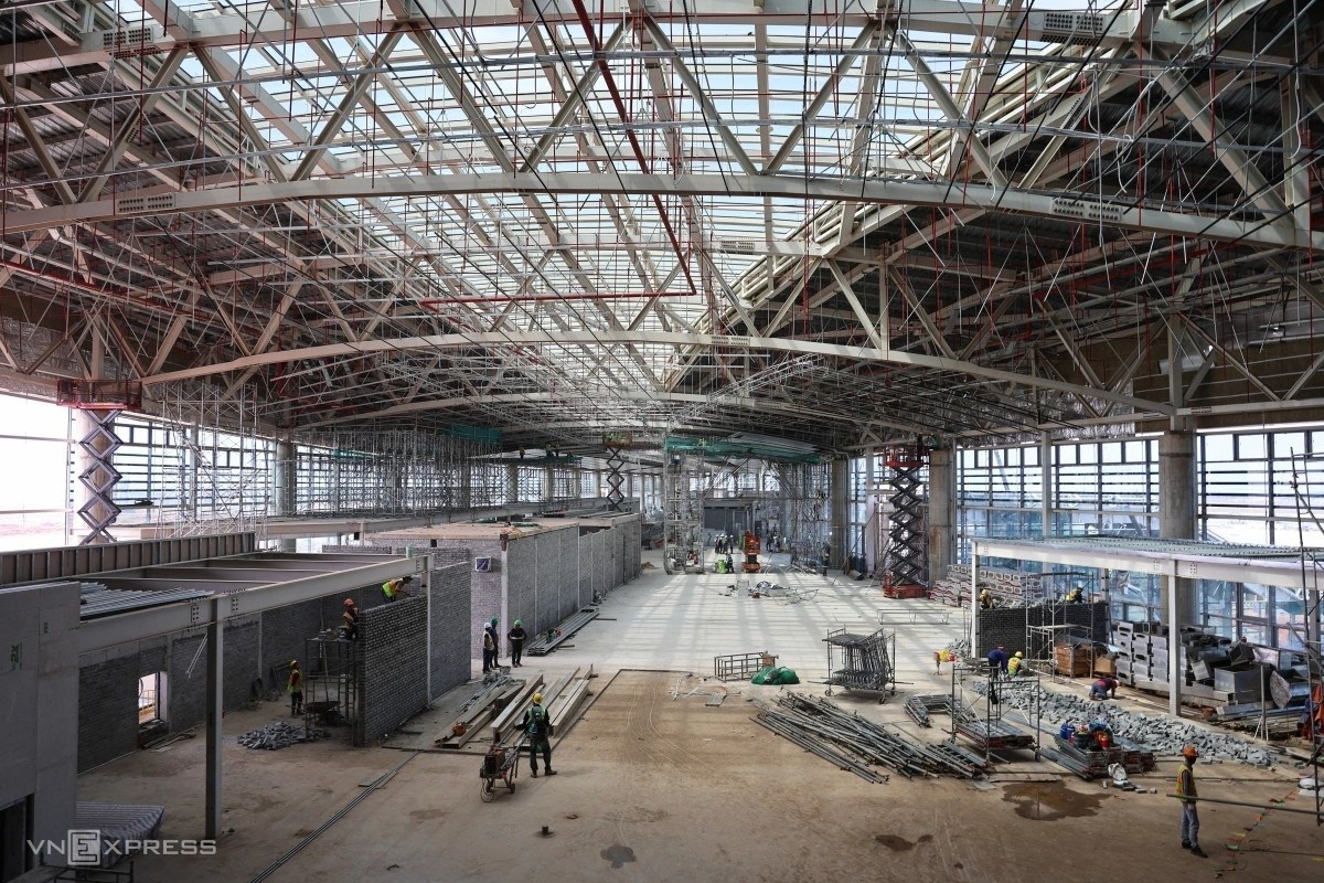 Bên trong nhà ga, ba tầng đang đồng loạt thi công lợp trần, lát nền, phòng chức năng, băng chuyền... ACV cho biết việc hoàn thiện nội thất, lắp đặt thiết bị và vận hành đồng bộ sẽ được chạy thử trước khoảng 6 tháng, rút ngắn so với hợp đồng.