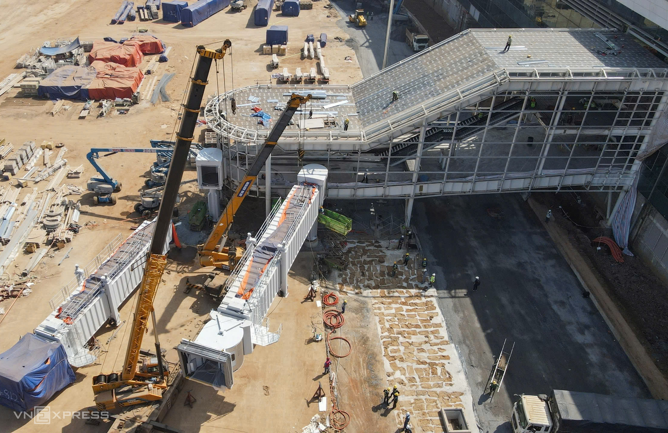 Xe cẩu lắp đặt cầu ống lồng, với hai cần cẩu 140 tấn phục vụ nâng hạ. Hàng trăm công nhân thi công khung, lợp mái, ốp kính các ống lồng còn lại. Theo thiết kế, sân bay Long Thành sẽ có 32 cầu ống lồng.