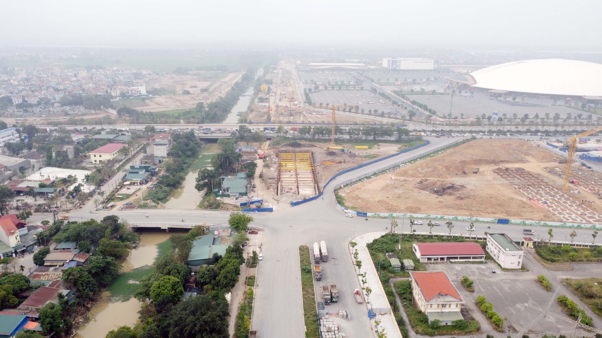 Sau khi hoàn thành dự án vào quý II/2027, toàn bộ tuyến đường được đầu tư đồng bộ với hè đường, chiếu sáng, cây xanh, hệ thống hạ tầng kỹ thuật, chỉnh trang đô thị, di dời công trình ngầm nổi và hoàn trả các công trình thủy lợi, đáp ứng đầy đủ các quy chuẩn, tiêu chuẩn kỹ thuật hiện hành sẽ tạo nên một diện mạo đô thị văn minh, hiện đại và an toàn. Trong ảnh là đoạn cầu vượt sông Ngũ Huyện Khê sang khu vực xã Dục Tú cũ mới bắt đầu tập kết máy móc.