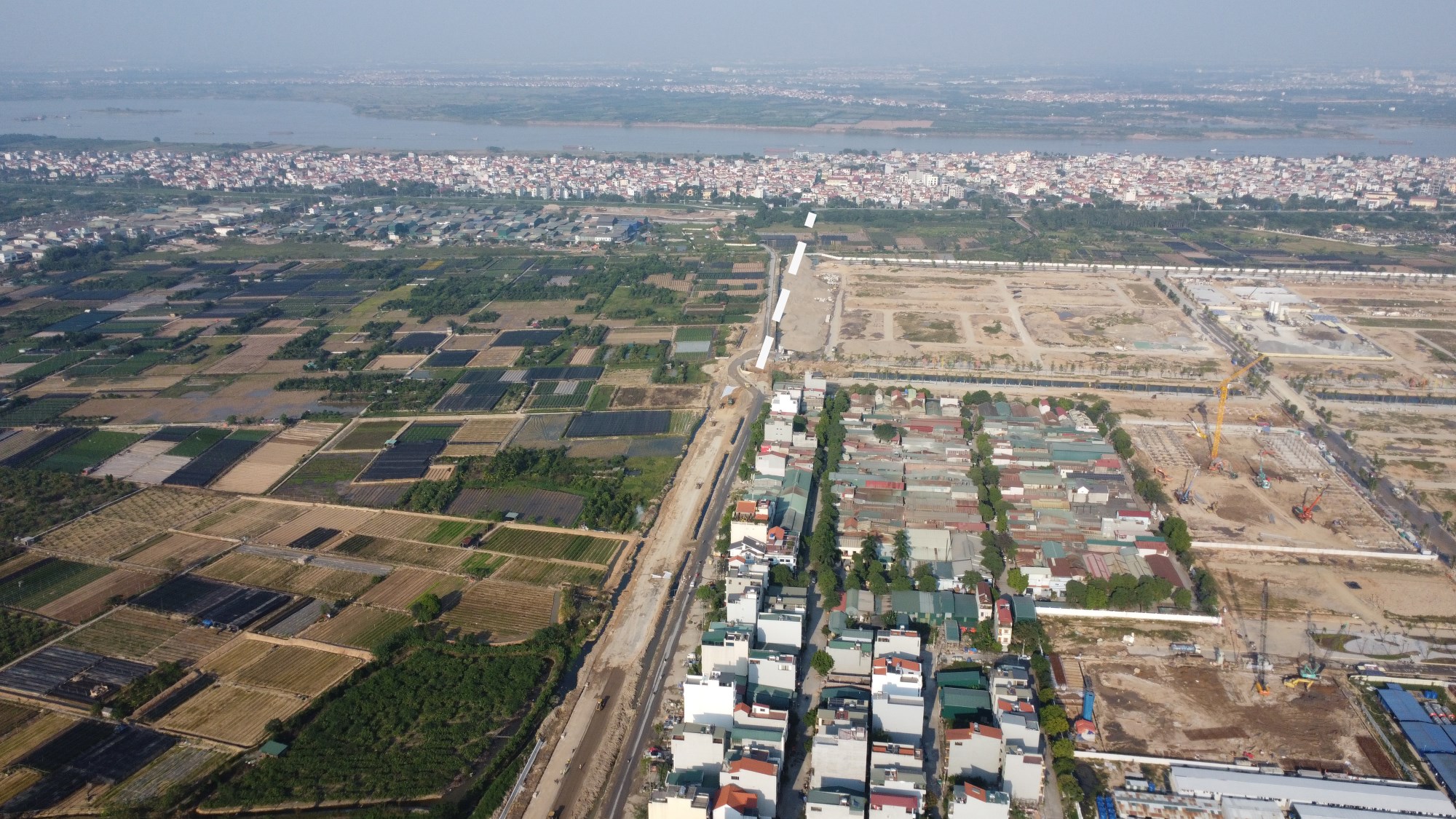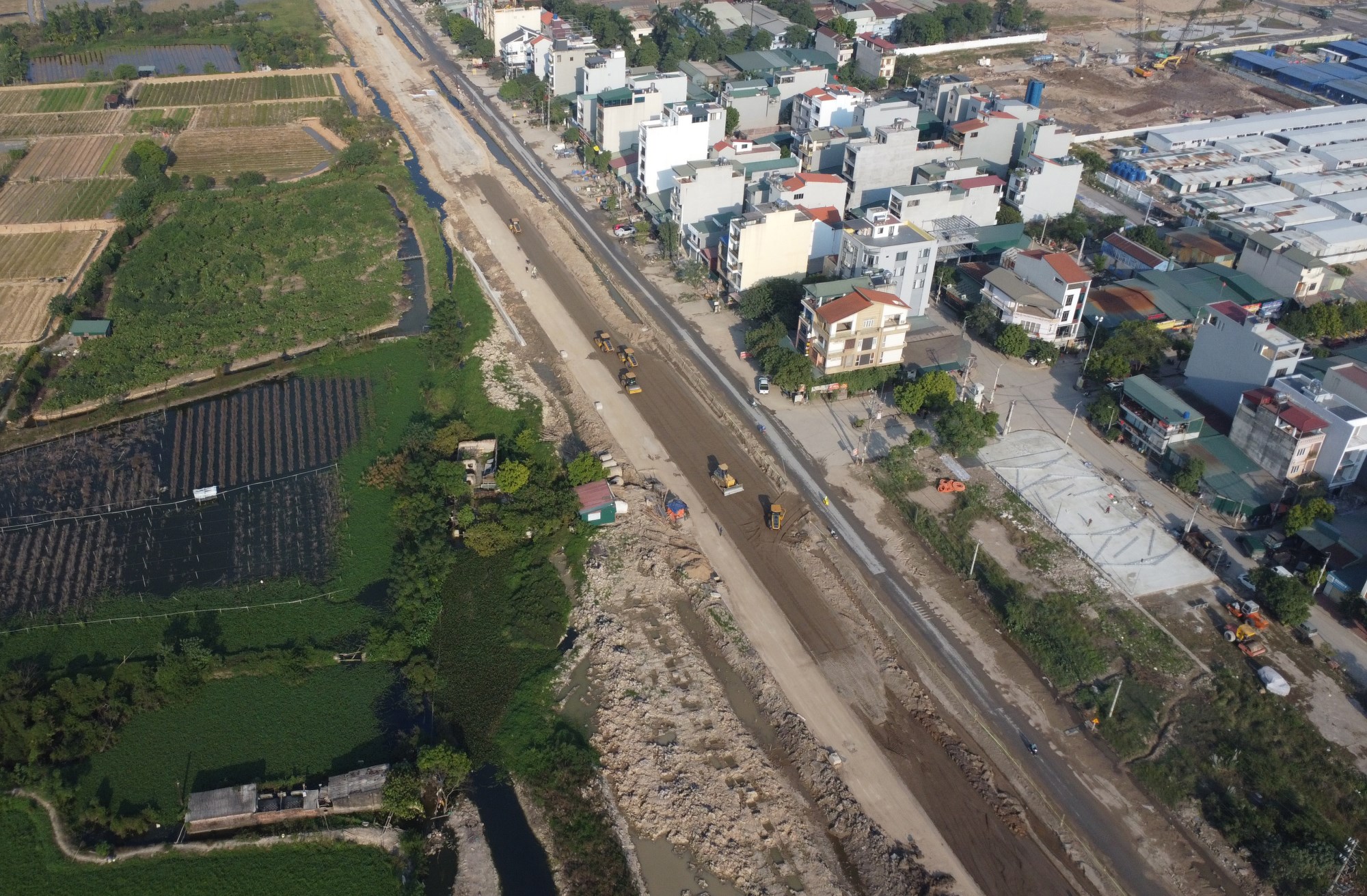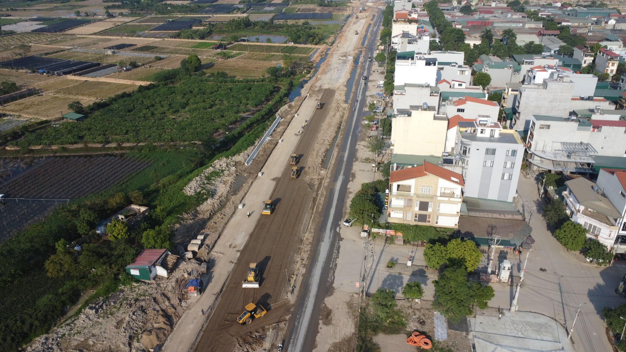 Tuyến đường đang thi công đoạn qua khu dân cư xã Tân Hội cũ. Toàn bộ công trường xây dựng trong ảnh là dự án Vinhomes Đan Phượng.
