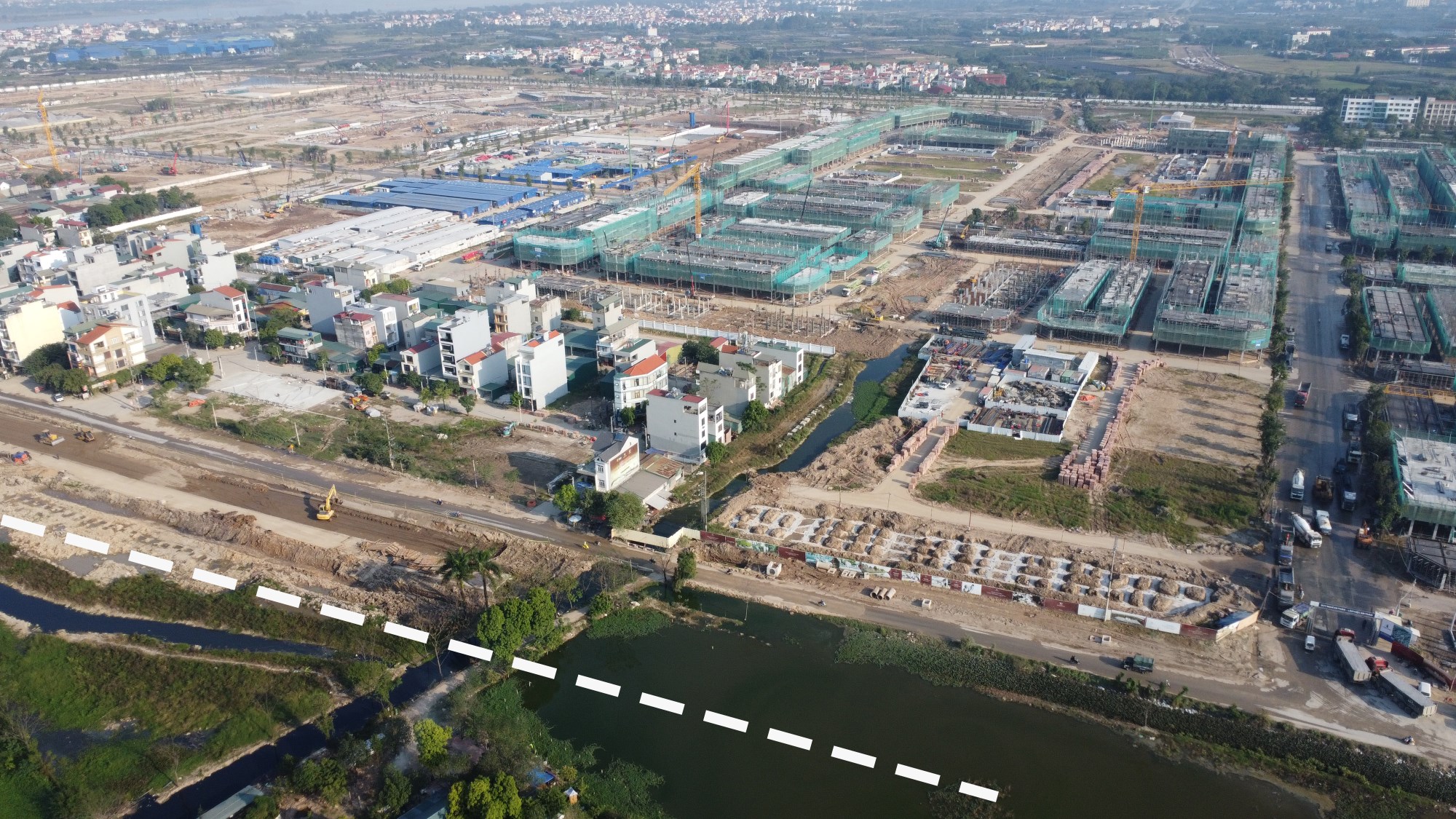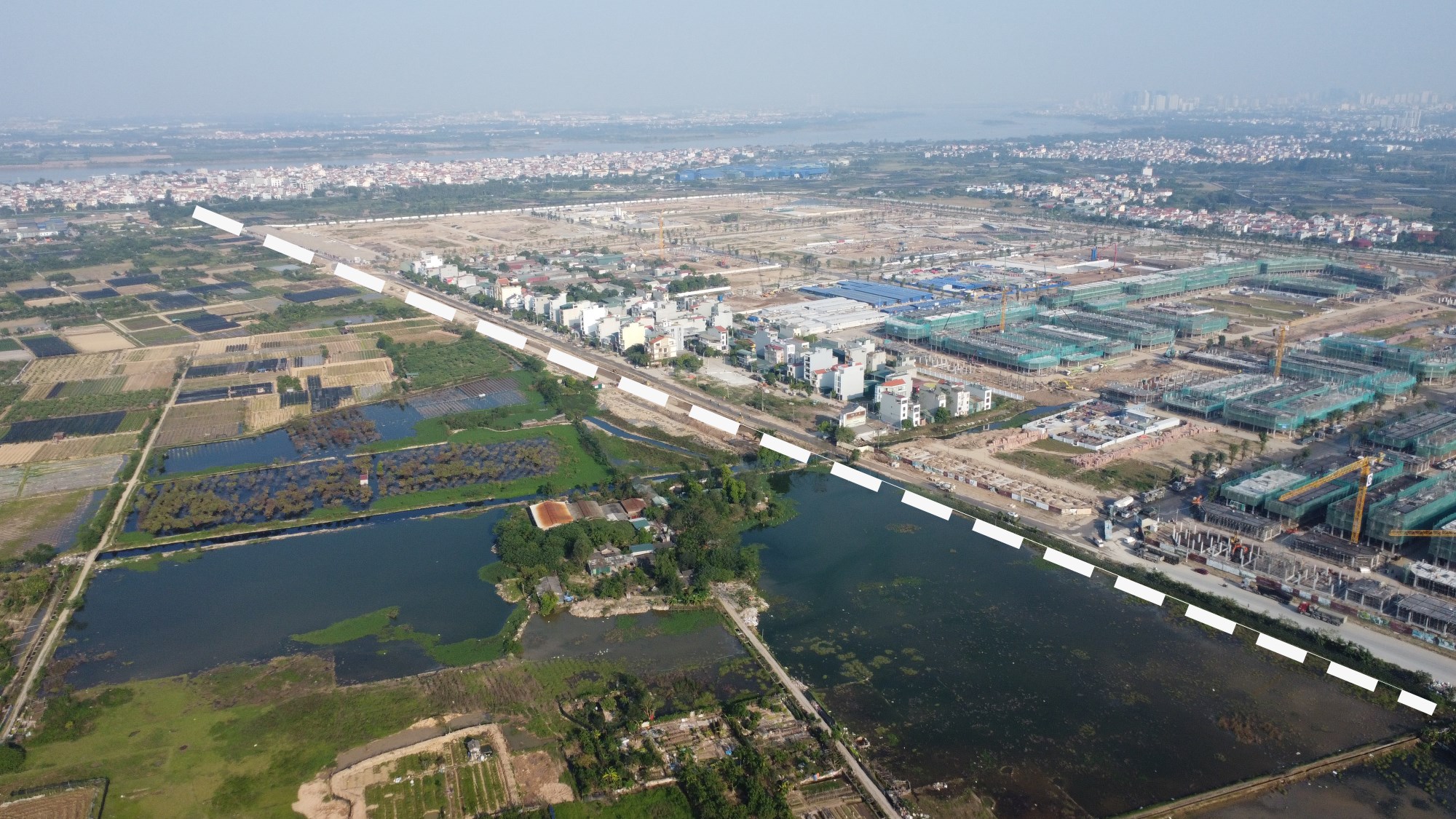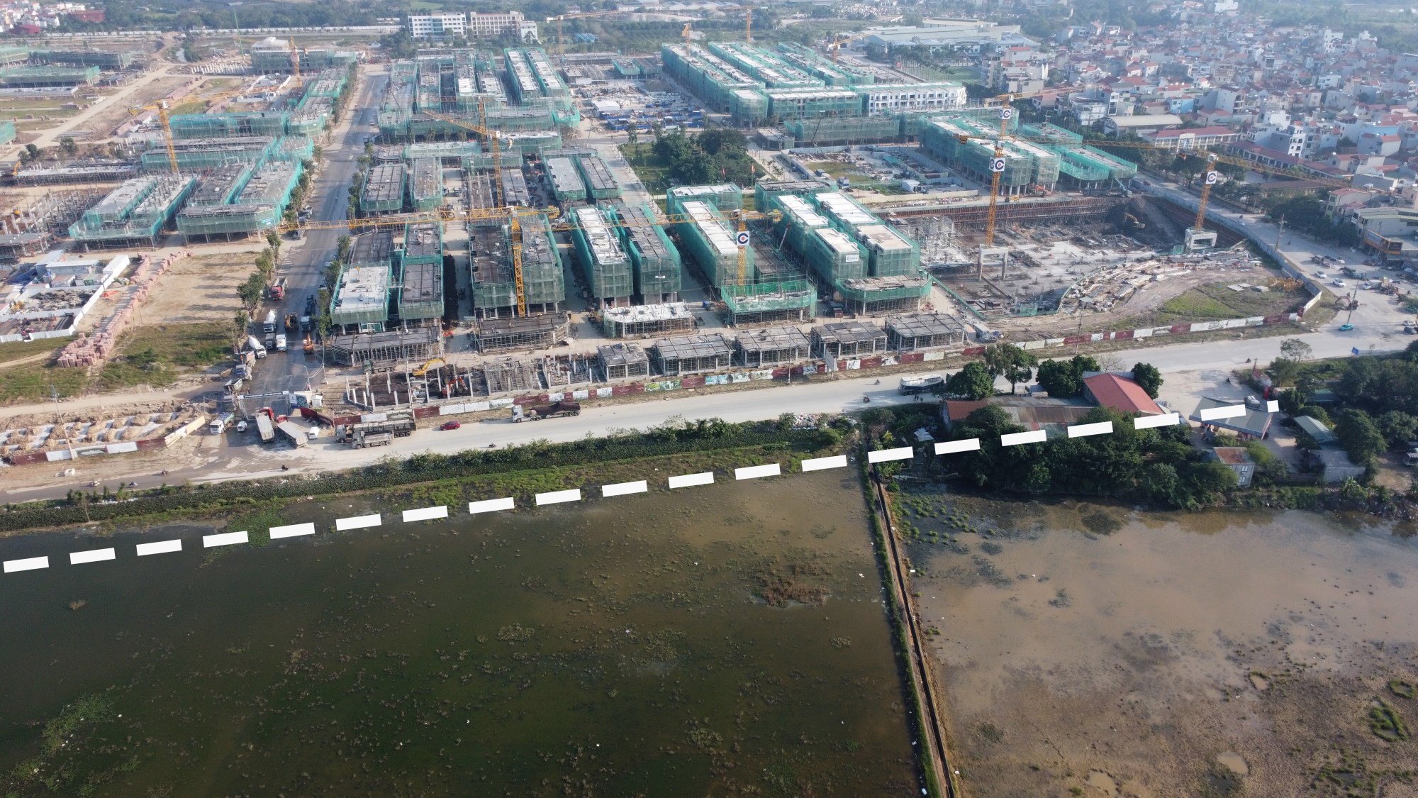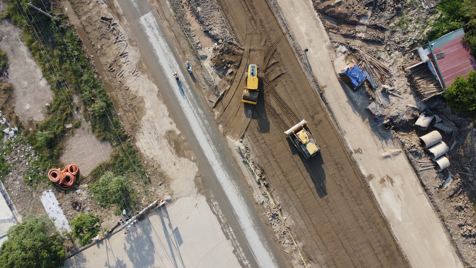 Tuyến đường đang thi công đoạn qua khu dân cư xã Tân Hội cũ. Toàn bộ công trường xây dựng trong ảnh là dự án Vinhomes Đan Phượng.