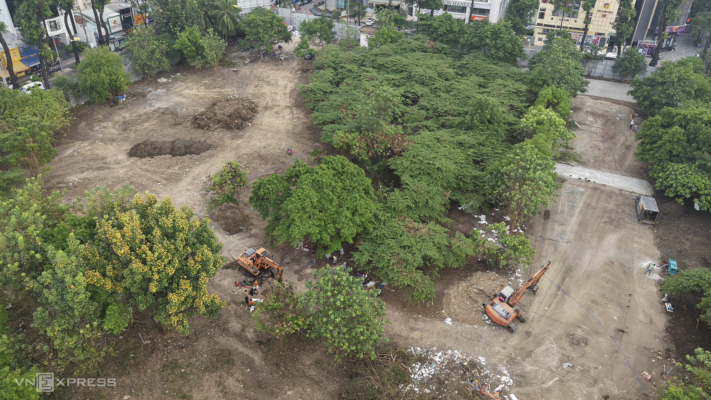 Bên trong khu đất, công nhân đang dọn dẹp mặt bằng, phát quang cỏ dại để trưng dụng làm công viên, vườn hoa Tết. Xung quanh, rào chắn được dựng lên, vỉa hè được chỉnh trang phục vụ cảnh quan.