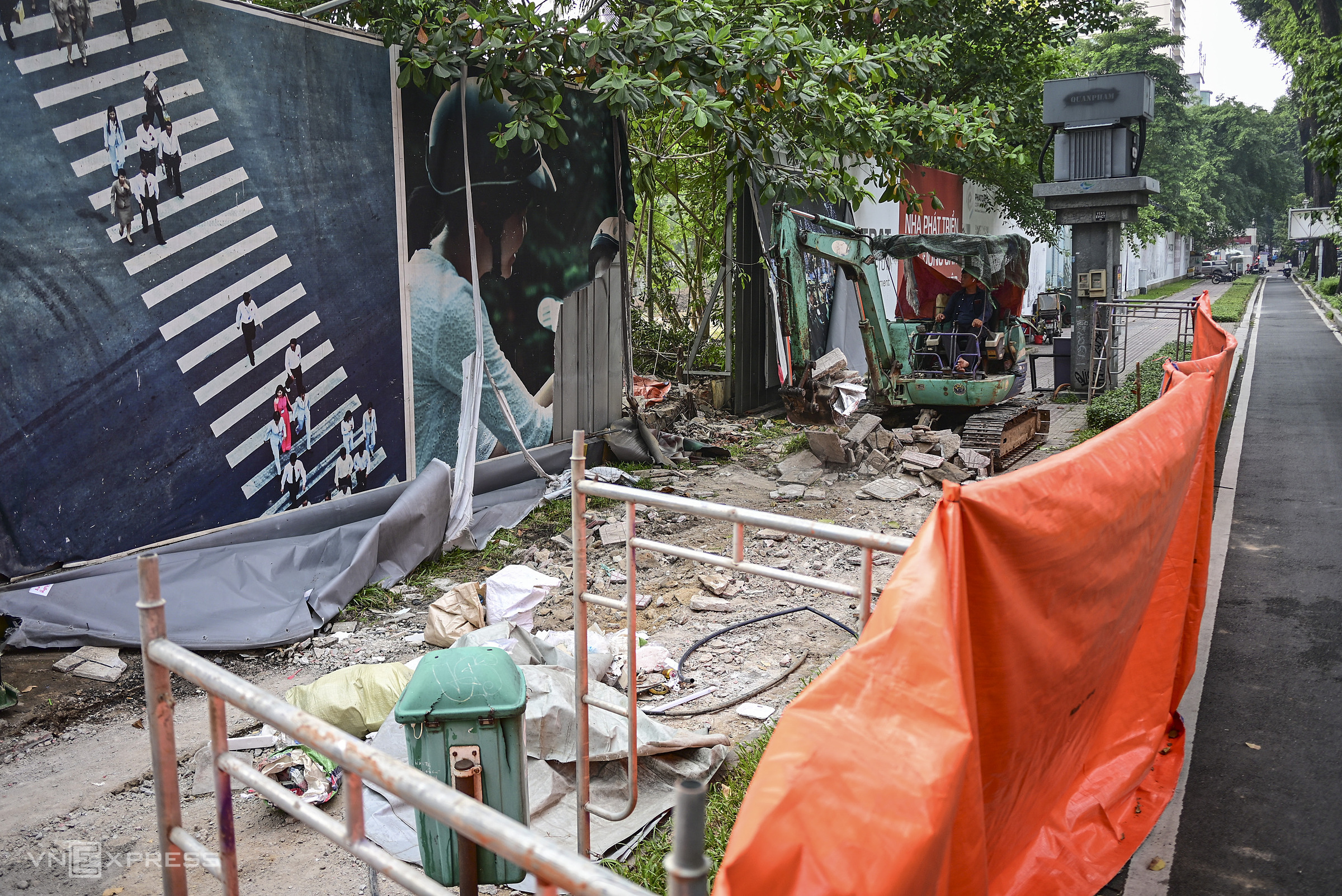 Do bỏ hoang nhiều năm, bảng thông tin dự án 74 Hồ Hảo Hớn (phường Cầu Ông Lãnh) bạc màu, bong tróc; khu vực rào chắn bị bôi bẩn, trở thành nơi tập kết xe thu gom rác.