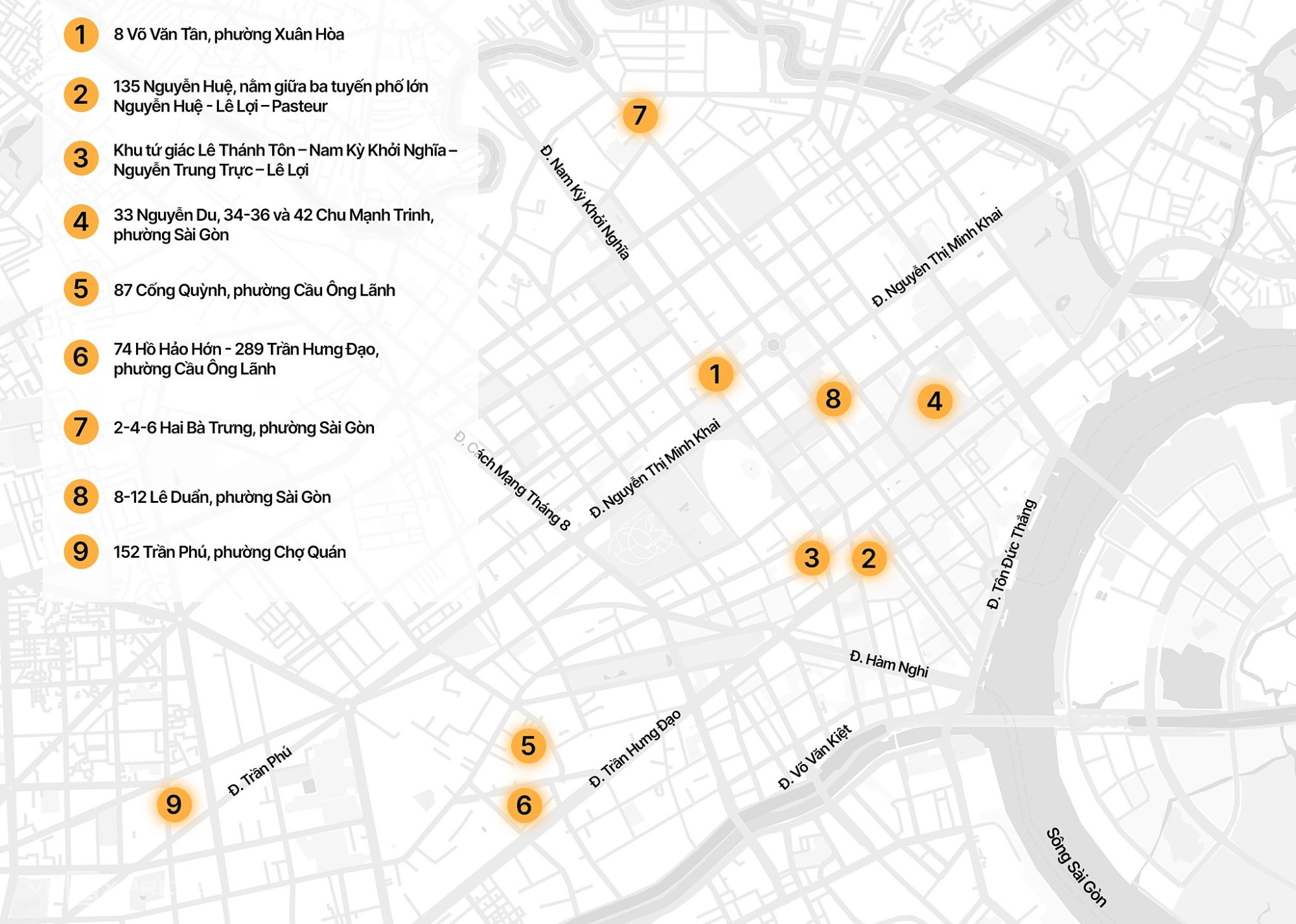 Hai lô đất rộng gần 6.300 m2 tại số 33 Nguyễn Du và 34, 36, 42 Chu Mạnh Trinh (phường Sài Gòn), trước đây do Công ty Vinafood 2 quản lý, đã bị TP HCM thu hồi do sai phạm. Từ năm 2022 đến nay, khu đất vẫn bỏ trống.