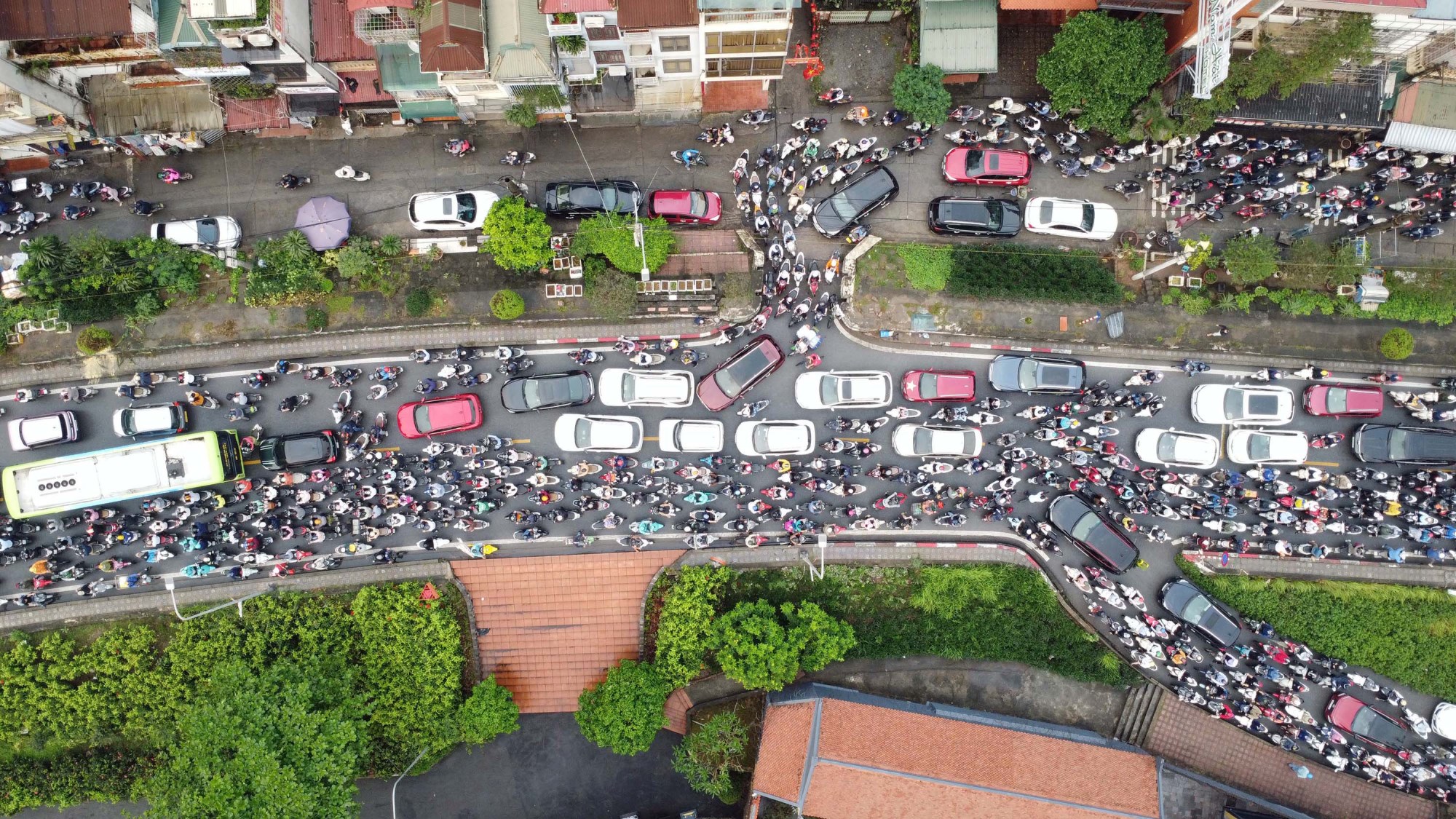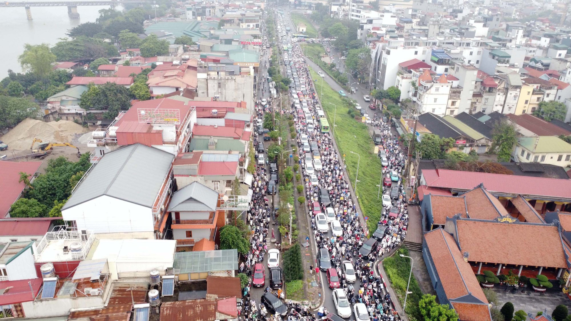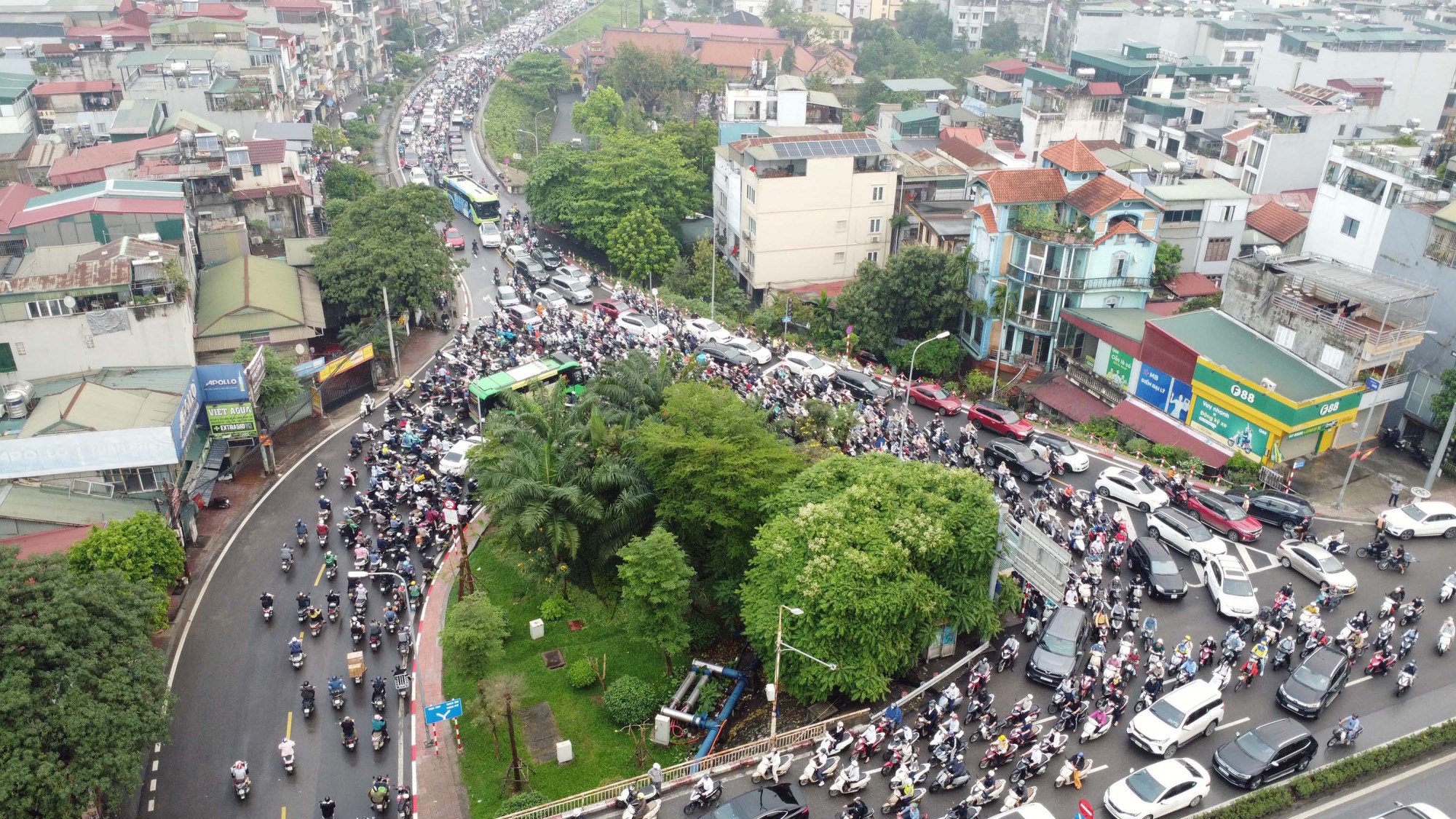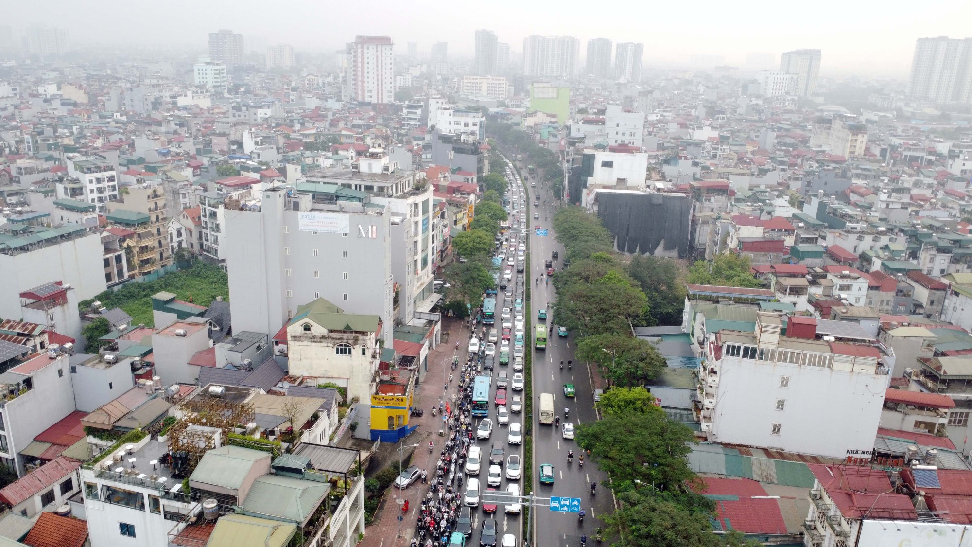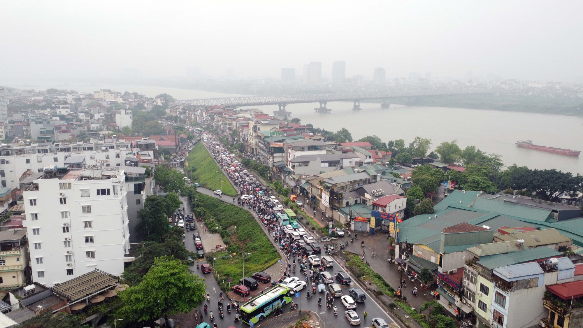 Đường Nguyễn Văn Cừ sáng 30/3 tắc dài chiều vào Hoàn Kiếm.
