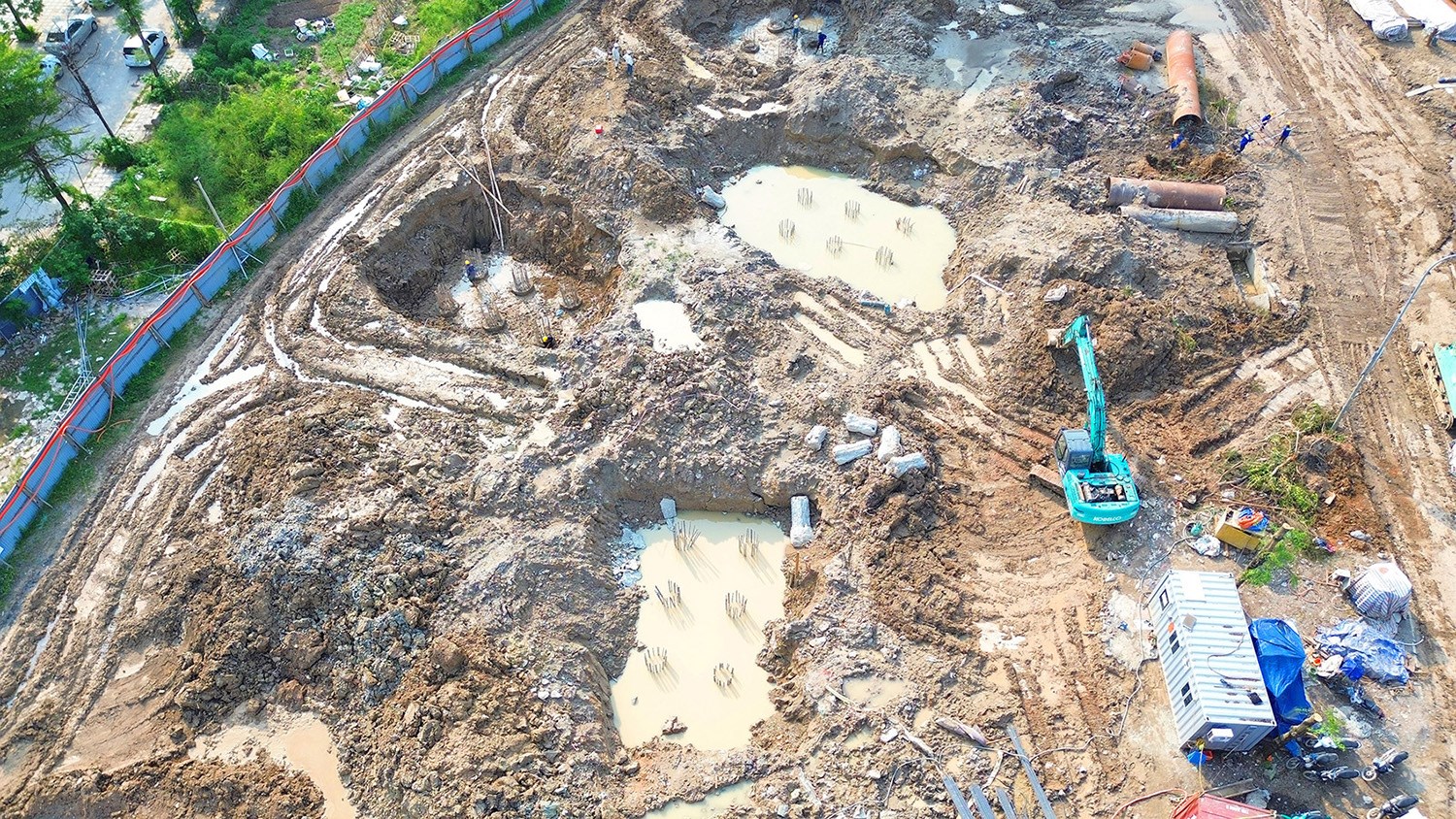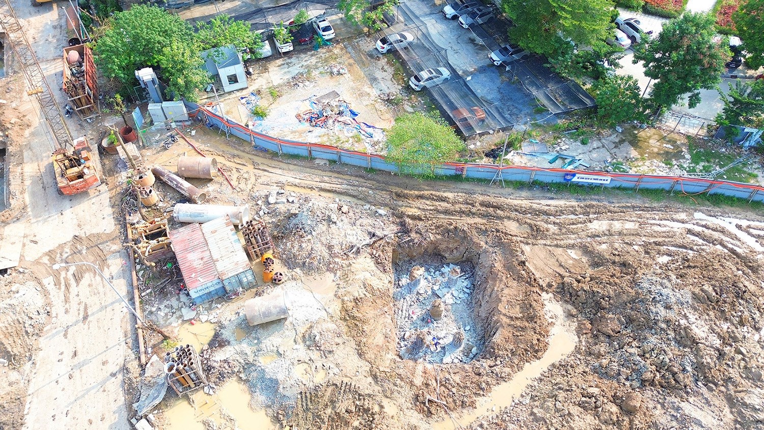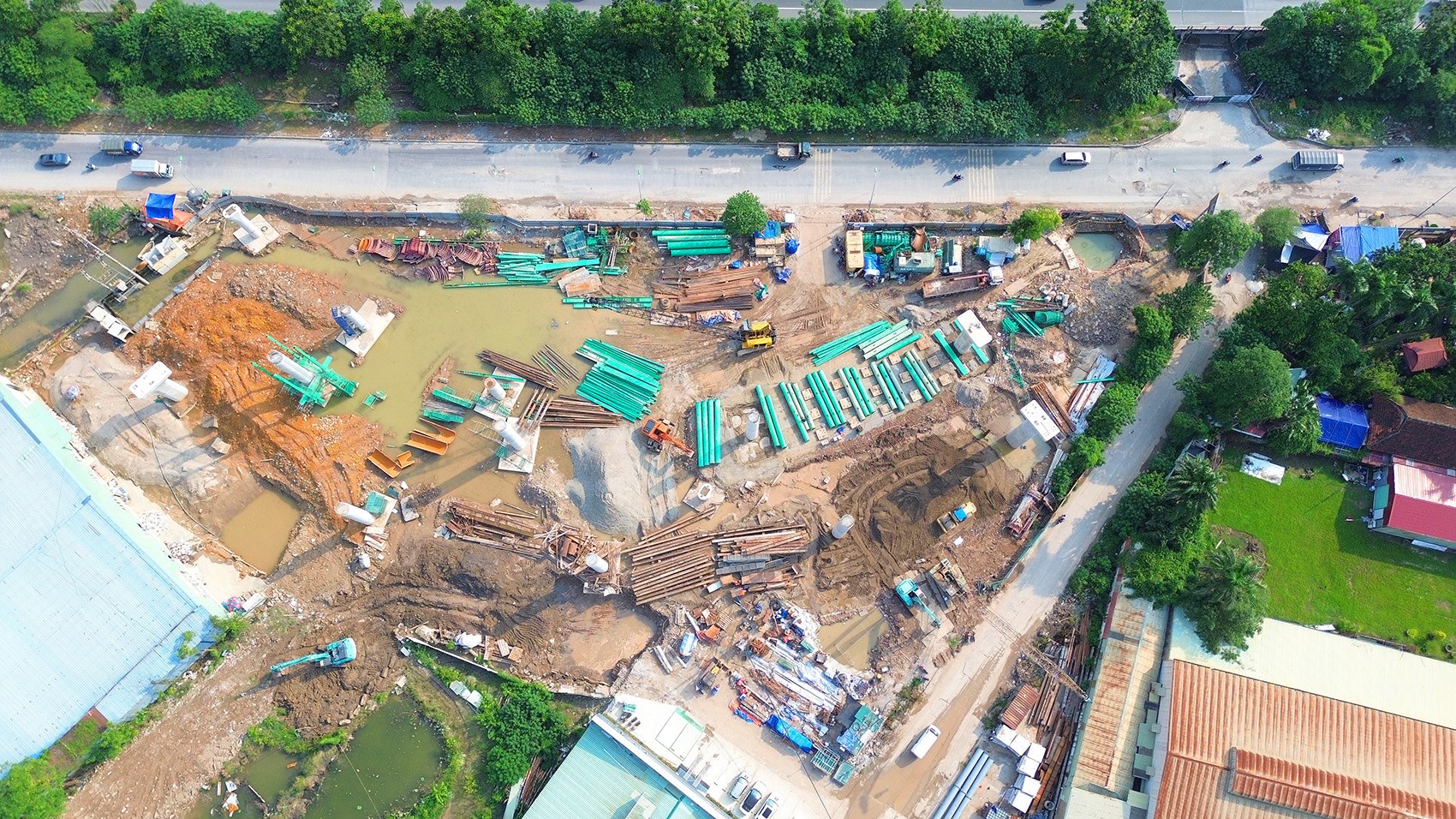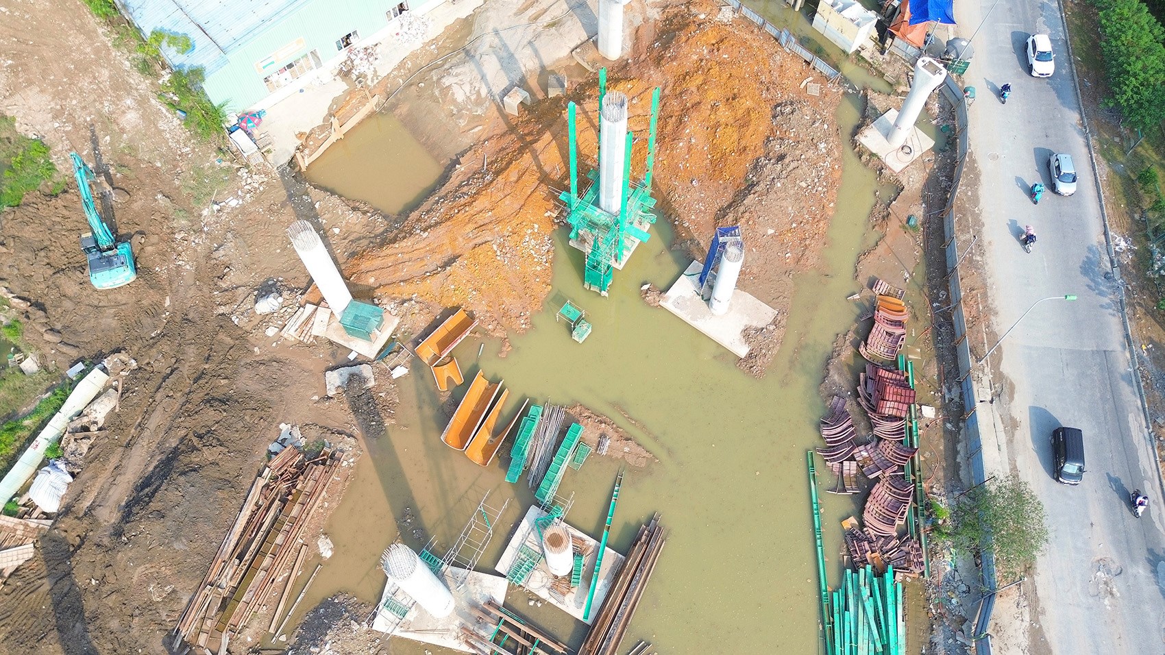 Hàng loạt máy móc hạng nặng như máy xúc, máy khoan cọc nhồi, cẩu tháp đã được huy động tối đa. Công nhân đang khẩn trương lắp khung thép để chuẩn bị xây dựng phần thô cho hạng mục cầu nhánh tuabin. Trong ảnh, bên phía vành đai 3,5 vẫn còn nhà xưởng chưa di dời.
